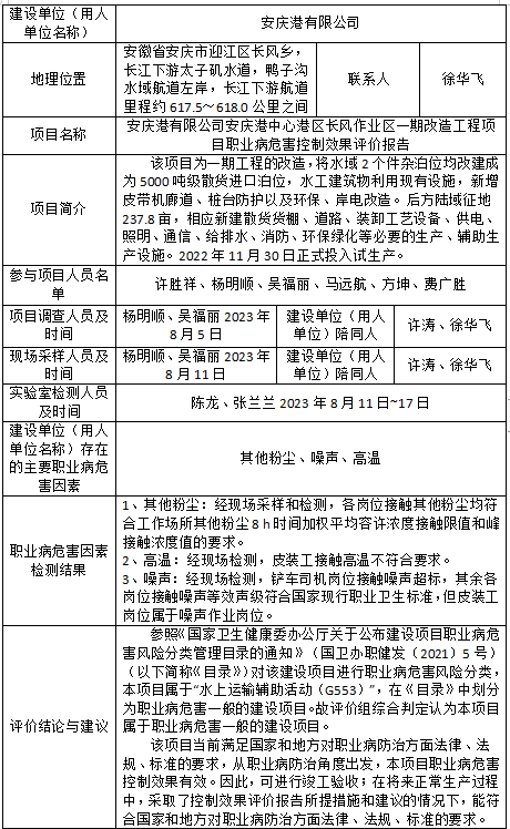 安庆港有限公司安庆港中心港区长风作业区一期革新工程项目职业病危害控制效果评价报告